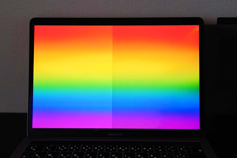 まずは色味がどのくらい変化するのか、画面にレインボーカラーを表示して比較してみます。